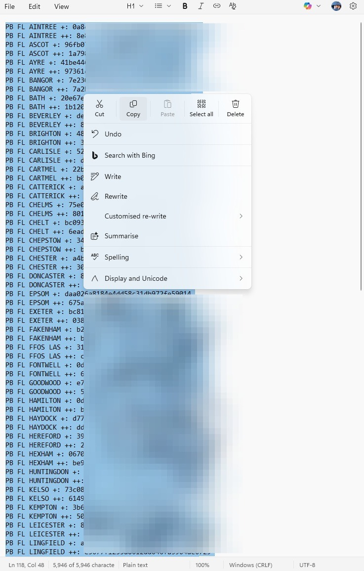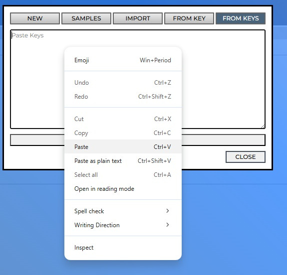 Crucially: Manually highlight only the key text, starting at the end of the final key and highlighting upwards. DO NOT highlight any blank space before or after the key text, as this will cause the import to hang.